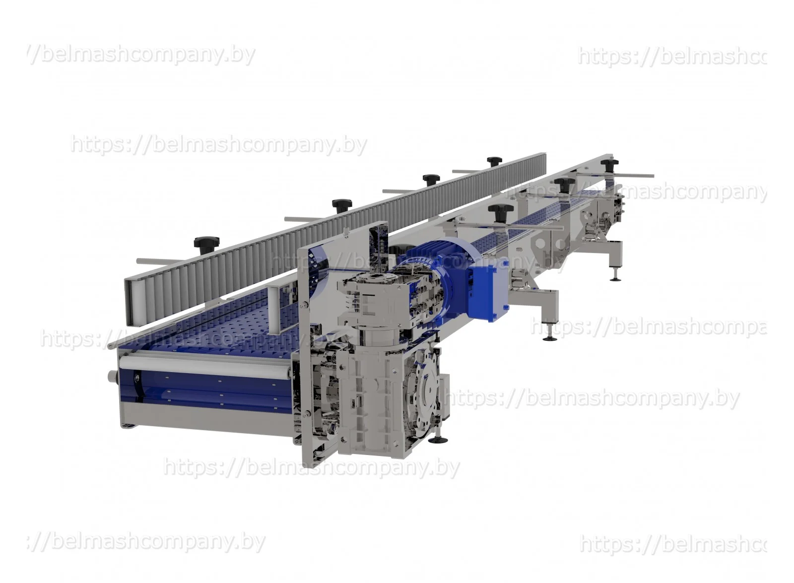 В конвейере используется модульная лента (POM), предназначенная для использования на предприятиях пищевого производства. Лента – открытая, что позволяет свободно мыть внутренние поверхности конвейера при обслуживании. Скорость движения ленты регулируется с помощью частотного преобразователя. Регулируемые боковые бортики имеют пластиковые ролики, которые вращаются при контакте с боковой поверхностью продукта, что обеспечивает её целостность. Конструкция конвейера обеспечивает жесткость, прочность, устойчивость и безопасность. Узлы и детали не имеют острых углов, кромок и поверхностей с неровностями. Материал изготовления каркаса – нержавеющая сталь марки AISI 304/316.