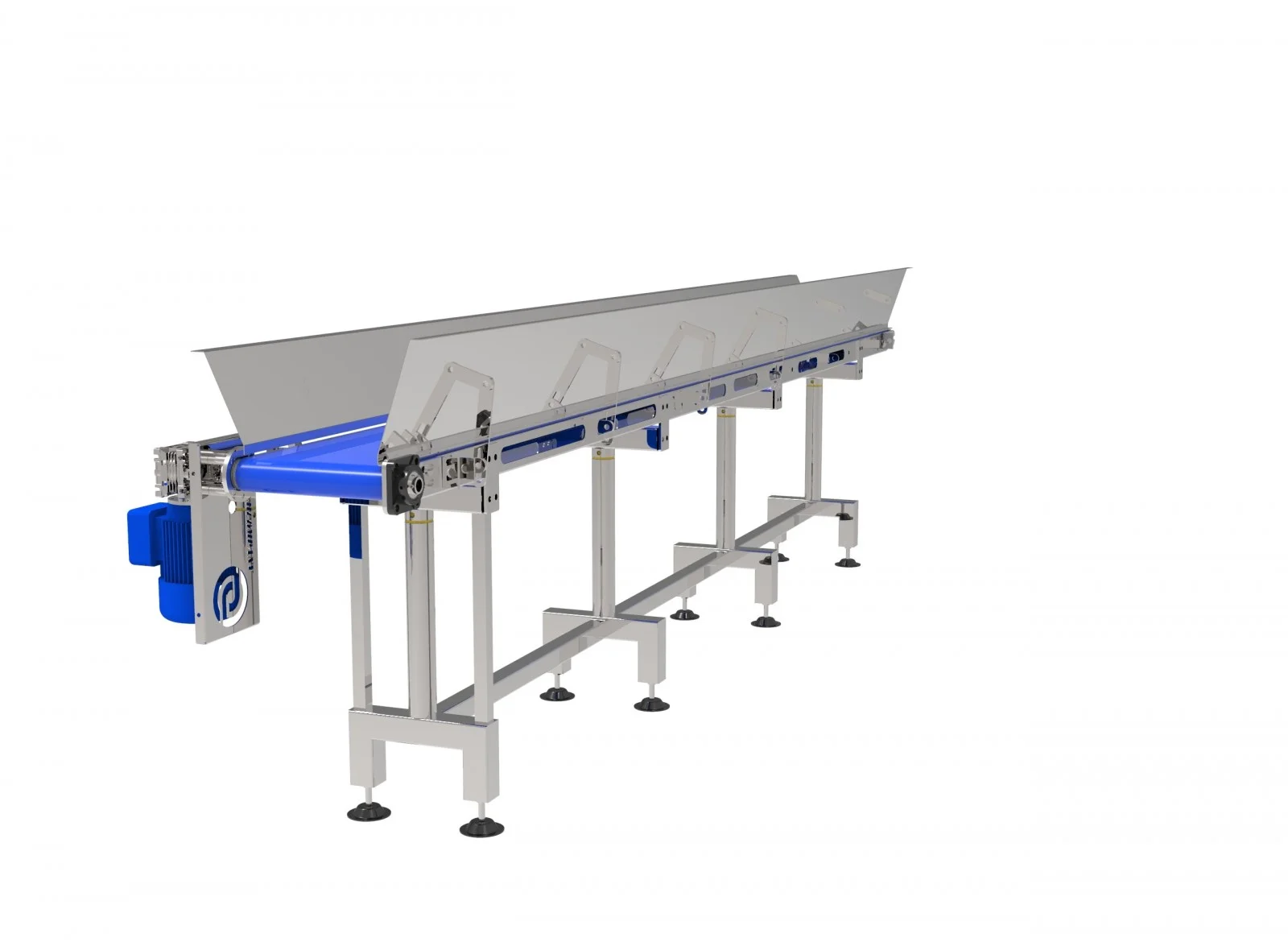 В данном конвейере используется бесконечная лента (ПВХ), предназначенная для использования на предприятиях пищевого производства. Конструкция конвейера обеспечивает жесткость, прочность, устойчивость и безопасность. Узлы и детали не имеют острых углов, кромок и поверхностей с неровностями. Материал изготовления каркаса – нержавеющая сталь марки AISI 304/316.