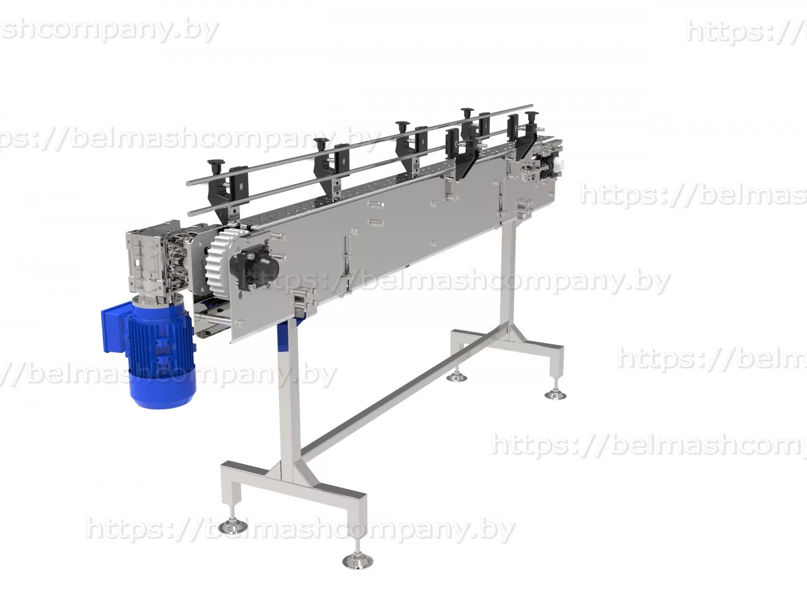 В данном конвейере используется цепная лента (материал – нержавеющая сталь марки AISI304), предназначенная для использования на предприятиях пищевого производства. Конструкция конвейера позволяет быстро заменить ленту и настроить ширину бортиков при обслуживании и эксплуатации. Конструкция конвейера обеспечивает жесткость, прочность, устойчивость и безопасность. Узлы и детали не имеют острых углов, кромок и поверхностей с неровностями. Материал изготовления каркаса – нержавеющая сталь марки AISI 304/316.